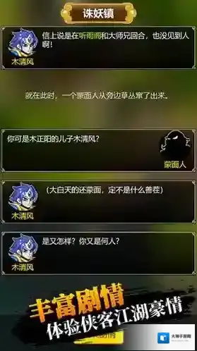 3、在【诛妖镇】剧情对话,选择回应蒙面人提问的选项,推进故事发展,解锁新任务与场景。