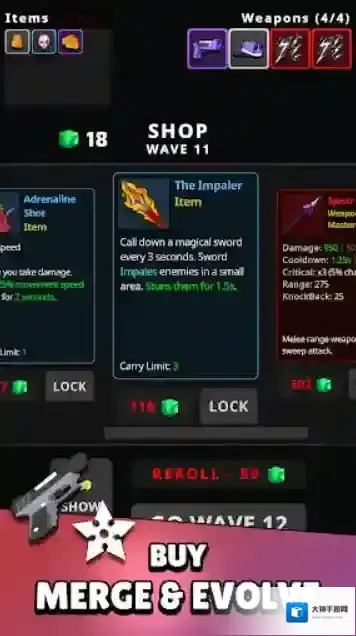 3、游戏中还可以通过购买相同武器进行合成,不断升级武器的威力,帮助你更快的消灭怪物。