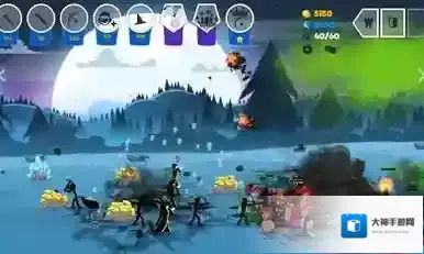 2、本关只要坚持四分半就可以结束,开局先一直召唤矿工和剑士,然后优先让矿工采集金块,当对面来进攻时就全体回撤,让城堡弓箭手来解决对手。