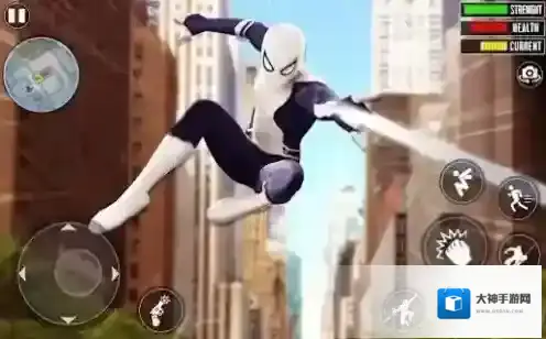1、通过虚拟摇杆与按键组合实现攀爬、飞跃、攻击等动作,灵活运用蛛丝穿梭于高楼之间。