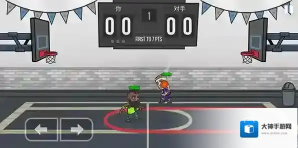2、我们按住屏幕左下角的两个箭头可以控制角色移动,用手指按住屏幕右侧空白区域可以控制角色跳投,不过跳投的时候的注意一点,在主角跳到空中的时候就得放开手指,否者我们的角色是不会将篮球投出去的。