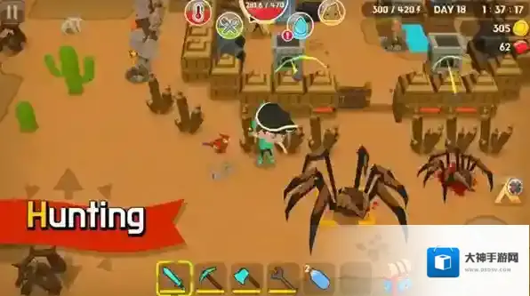 打猎的话,是这个游戏最坑的部分之一了。鸡猪蜘蛛公鹿都会伤人,兔子松鼠母鹿梅花鹿又跑得飞快。这时候陷阱就派上很大用场了。看到蜘蛛的时候,在附近放一个陷阱,等它来追你你就走开,它会自己跑到陷阱里。其他动物的话,直接把光标动物在的地方,放陷阱,它就会自己找死,你就等着收肉吧。