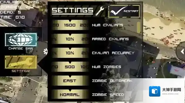 打开游戏右上角的设置按钮,参数中可以对平民和僵尸分别设置,平民的数量、平民武装的百分比、僵尸的数量、僵尸移动的速度和僵尸出现的位置等等一系列参数。